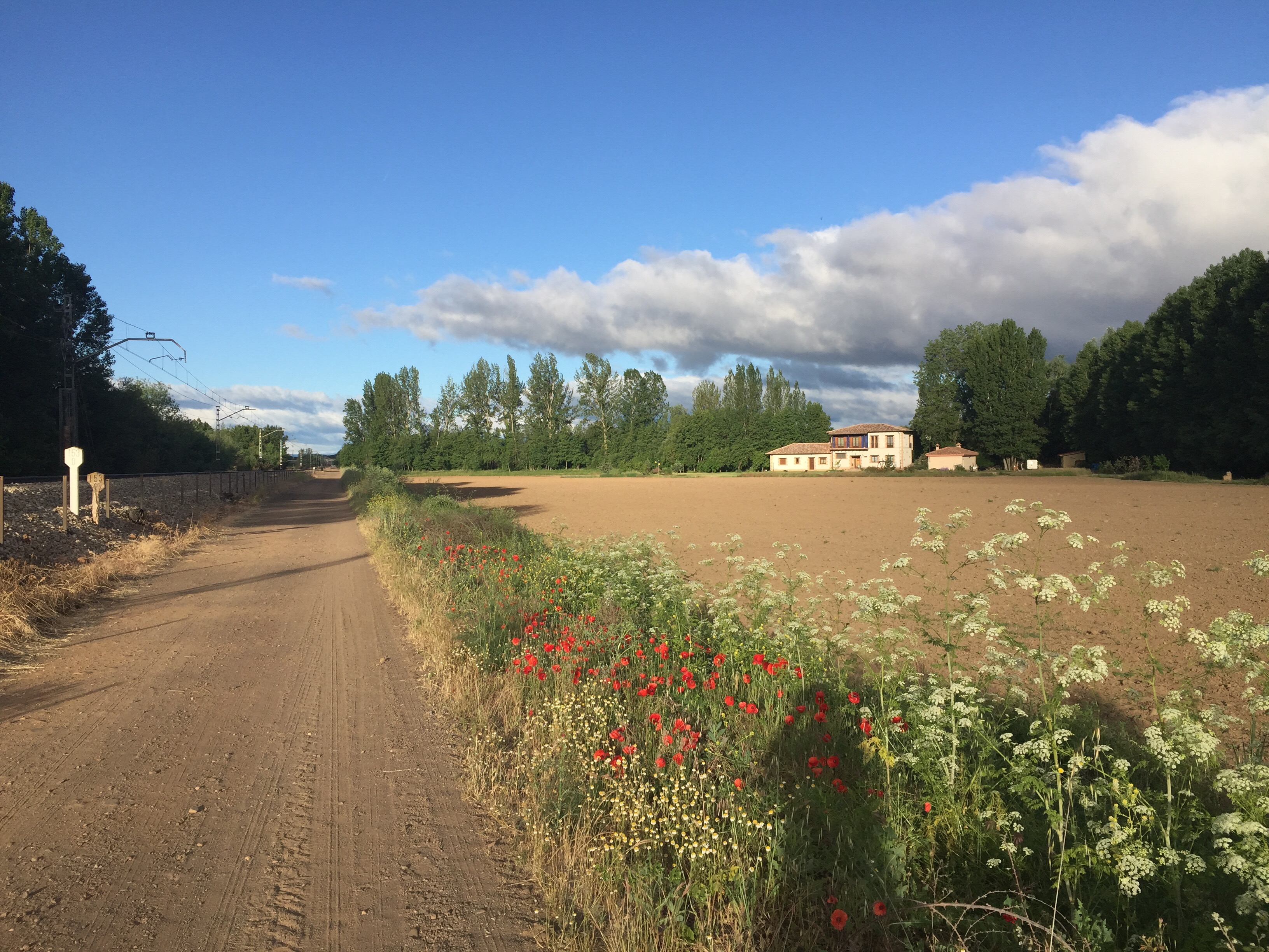 The Camino splits into two different ways, one noted as a bit longer and away from the road but with few villages or places to get food and water. We decide to take this way which was actually on an old paved road much of the way. The terrain was mostly flat and the typical farmland as far as you could see but I still find this scenery beautiful as it is so open and green. Because there weren’t many landmarks or villages, we weren’t sure exactly where we were.