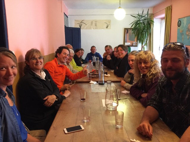 We went back in the evening for a communal diner at the albergue for eight euros each. There were about fifteen people and we sat next to a Danish man, a Hungarian woman, a Norwegian woman, and a couple from Las Vegas. The food was almost gourmet. Carrot soup, exotic salads, spaghetti for everyone, and special pesto Alfredo spaghetti for me, and then custard pudding. And of course, all the wine anyone wanted. The two albergue just were funny, and just so friendly that it made everyone feel at home. Great meal and company!