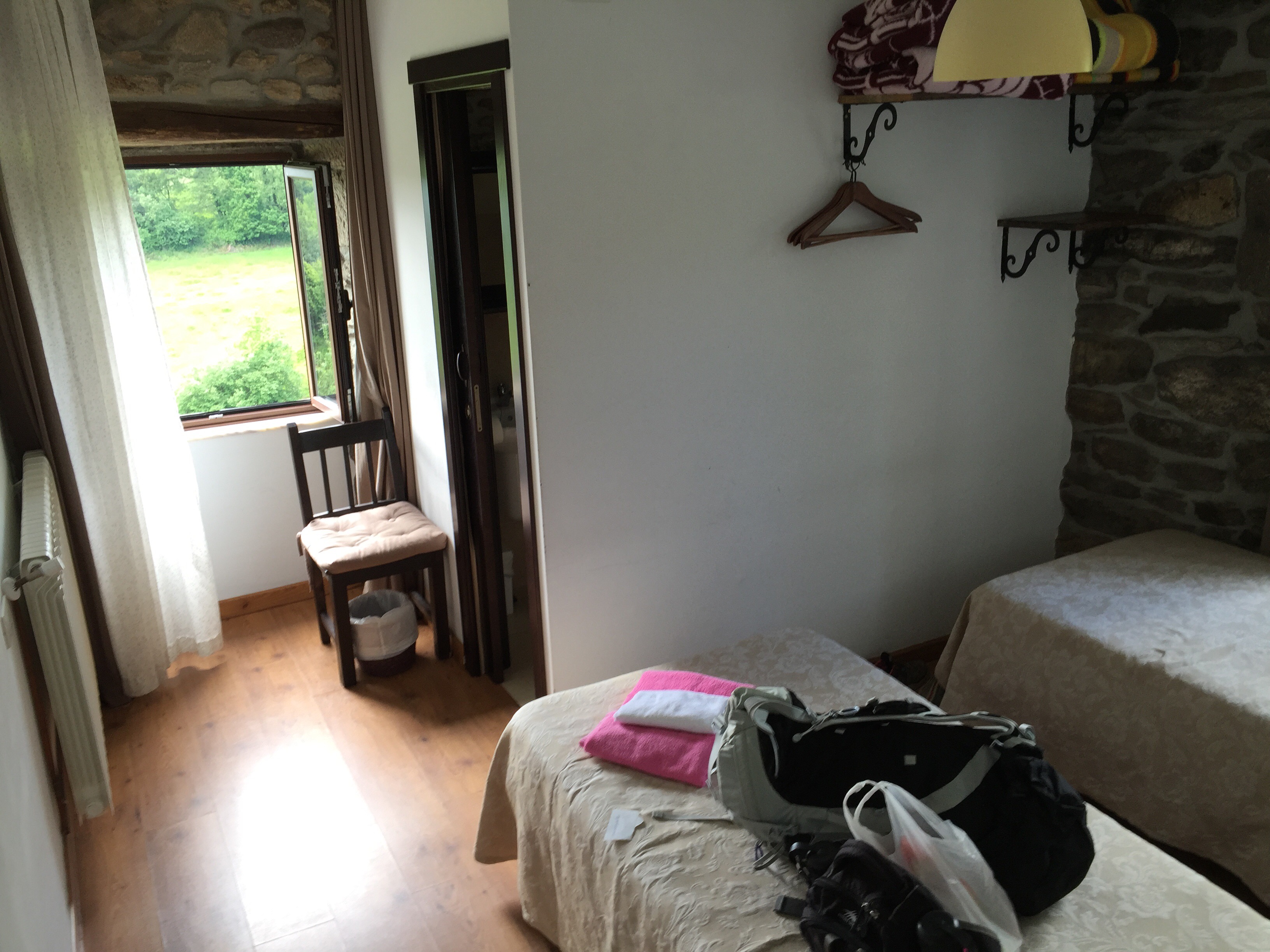 We left town with a fairly large group of pilgrims and hoped that we wouldn’t be competing with all of them for lodging but we did. We made it a point to get well outside of Sarria before looking for lodging and found many were booked through reservations or had already filled up. We trekked close to 5:00 PM and had gone twenty-three miles when we found this wonderful albergue in the middle of nowhere. It had a great location looking out to the mountains and it had a great atmosphere. We were fortunate and got a private room with a bath for about 35 euros.