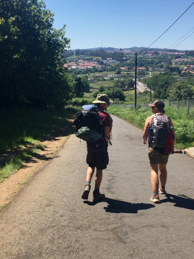 Approaching Santiago de Compostela. Matt an English pilgrim and Monica