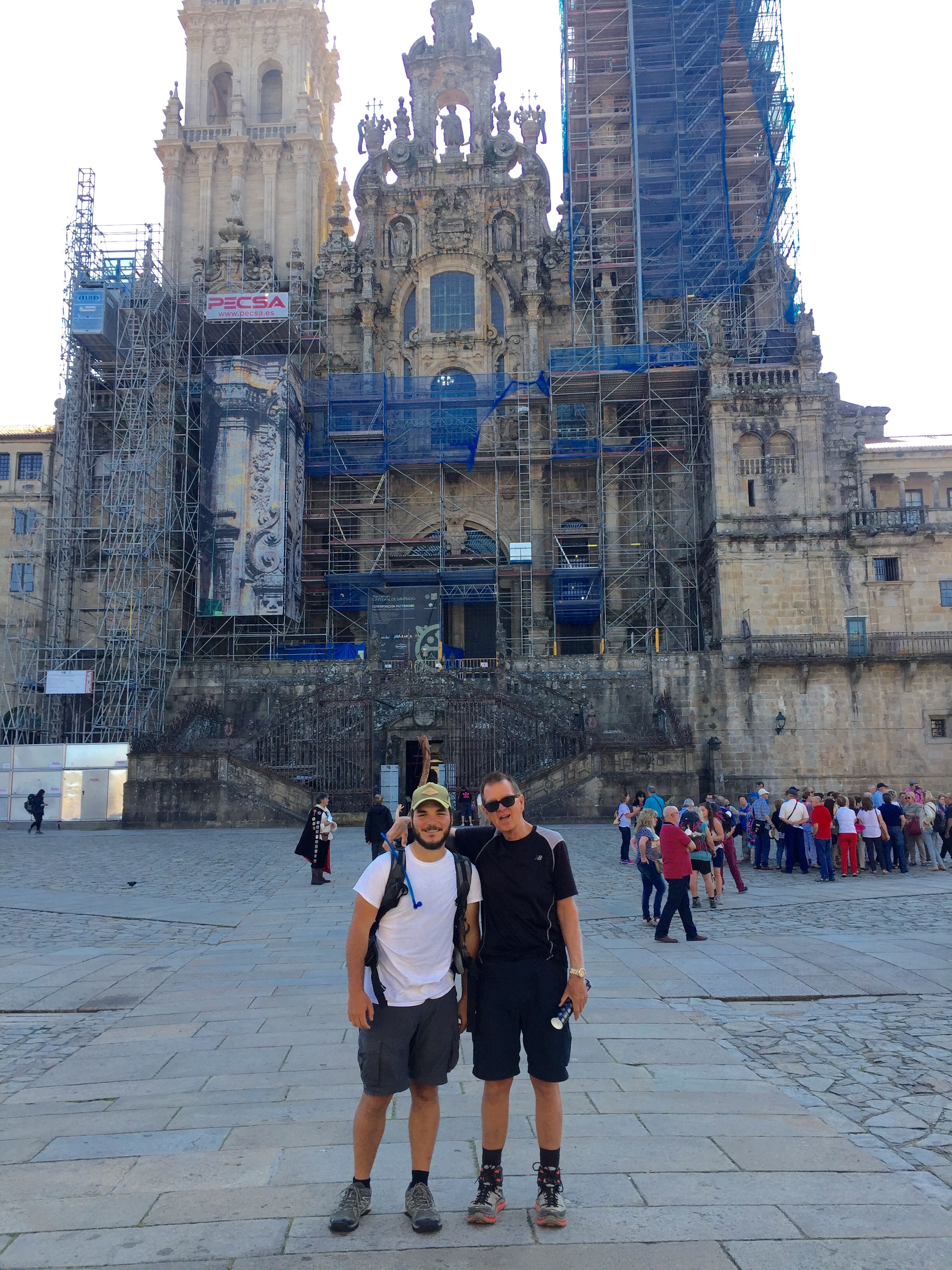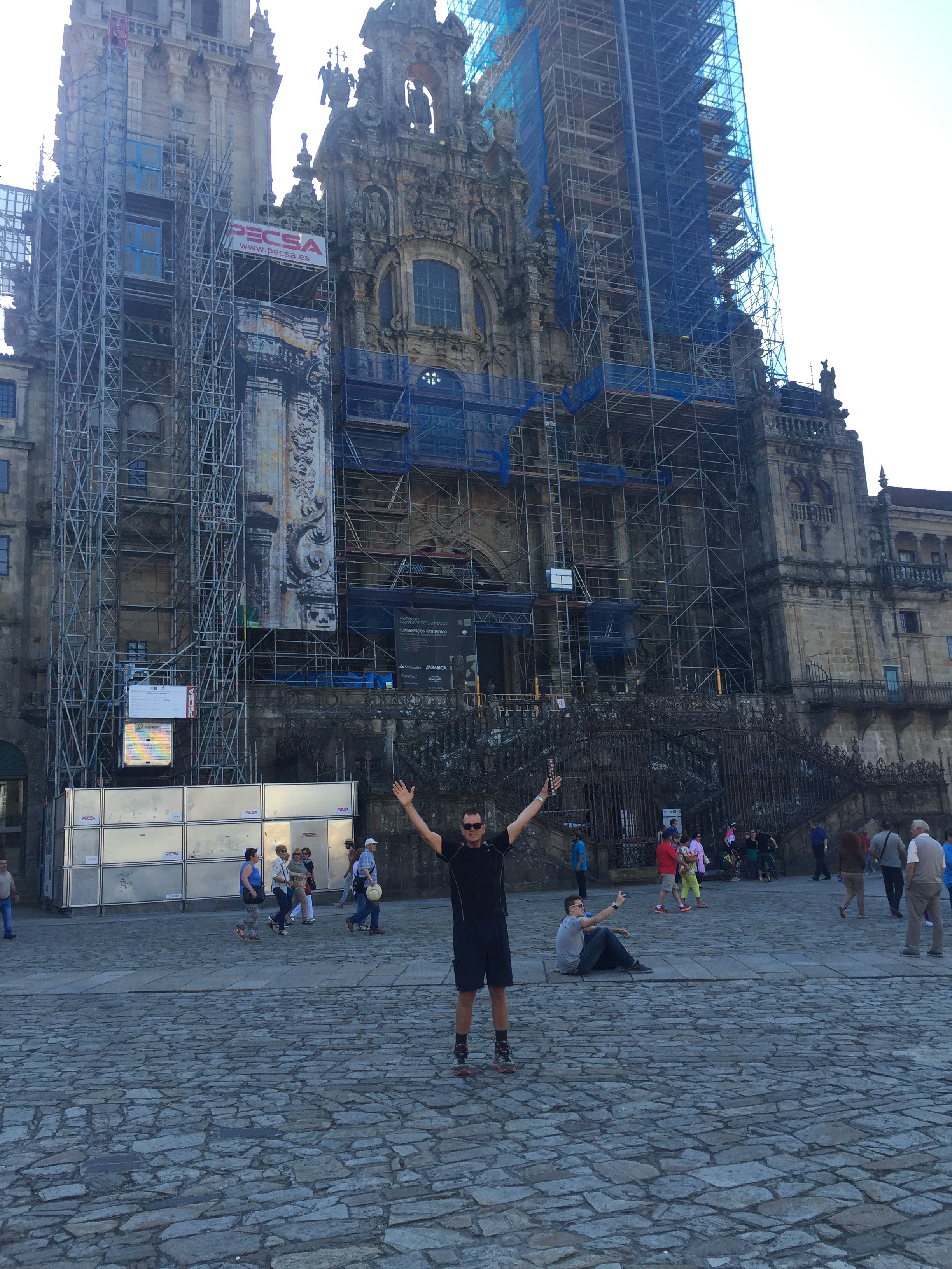 We finished! In front of the cathedral Santiago de Compostela, which is under repair construction