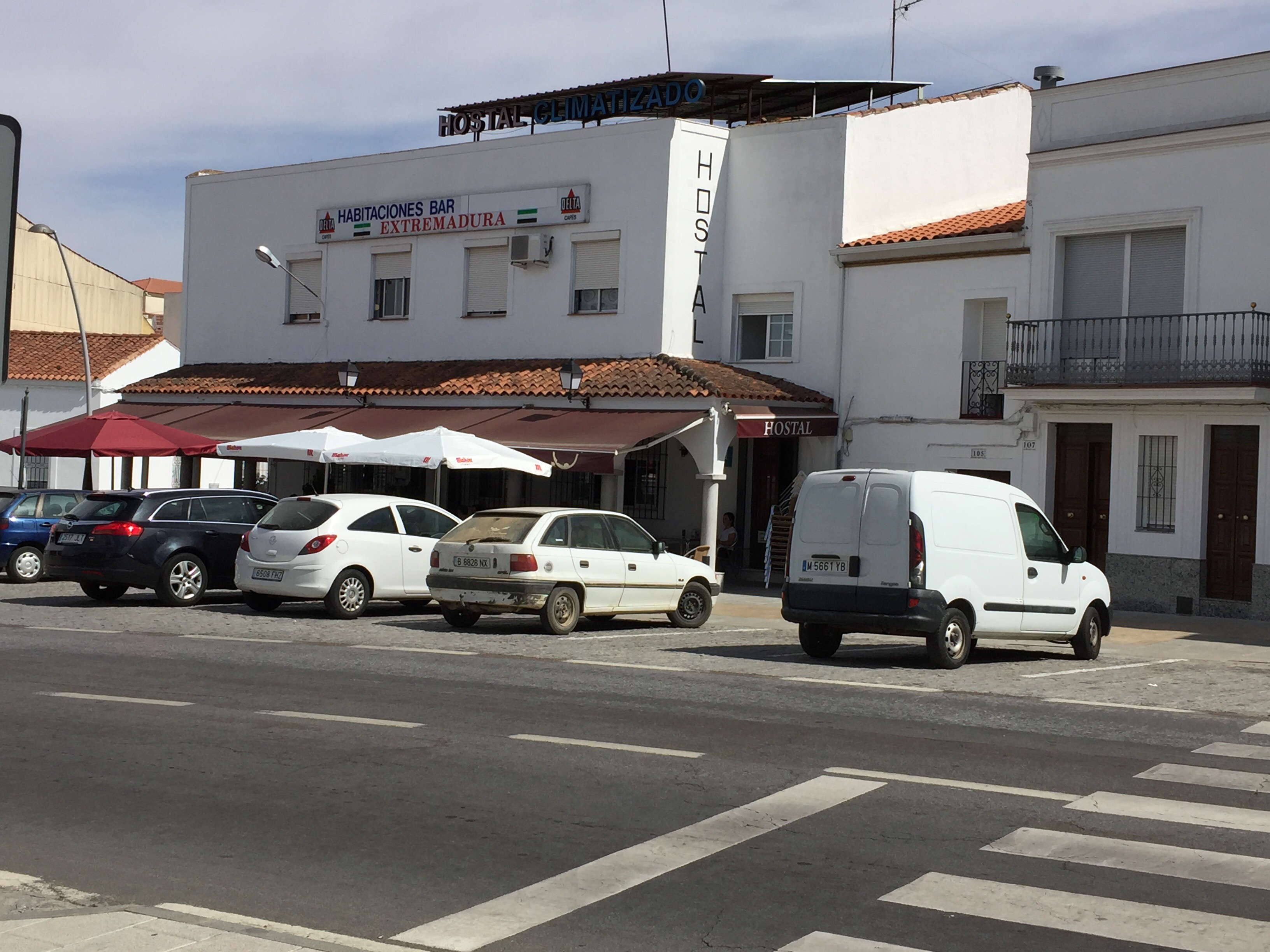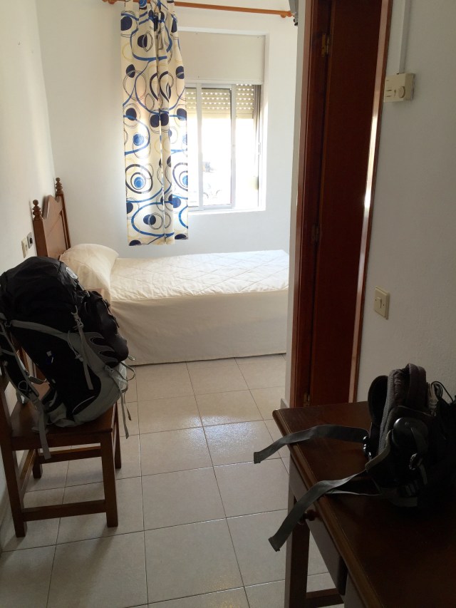 I could see that I was almost approaching the outskirts of town and saw a restaurant/hotel, Hostal Xtremadura, and it looked busy, which could mean expensive (for Spain anyway). The owner showed me the one bed room with a private bath that was really clean. It was at the front and had a view of the street and patio area, which I like to people watch and hear. I was a little shocked when she told me it was 12€ (euros), which is about $13.50. I took it!