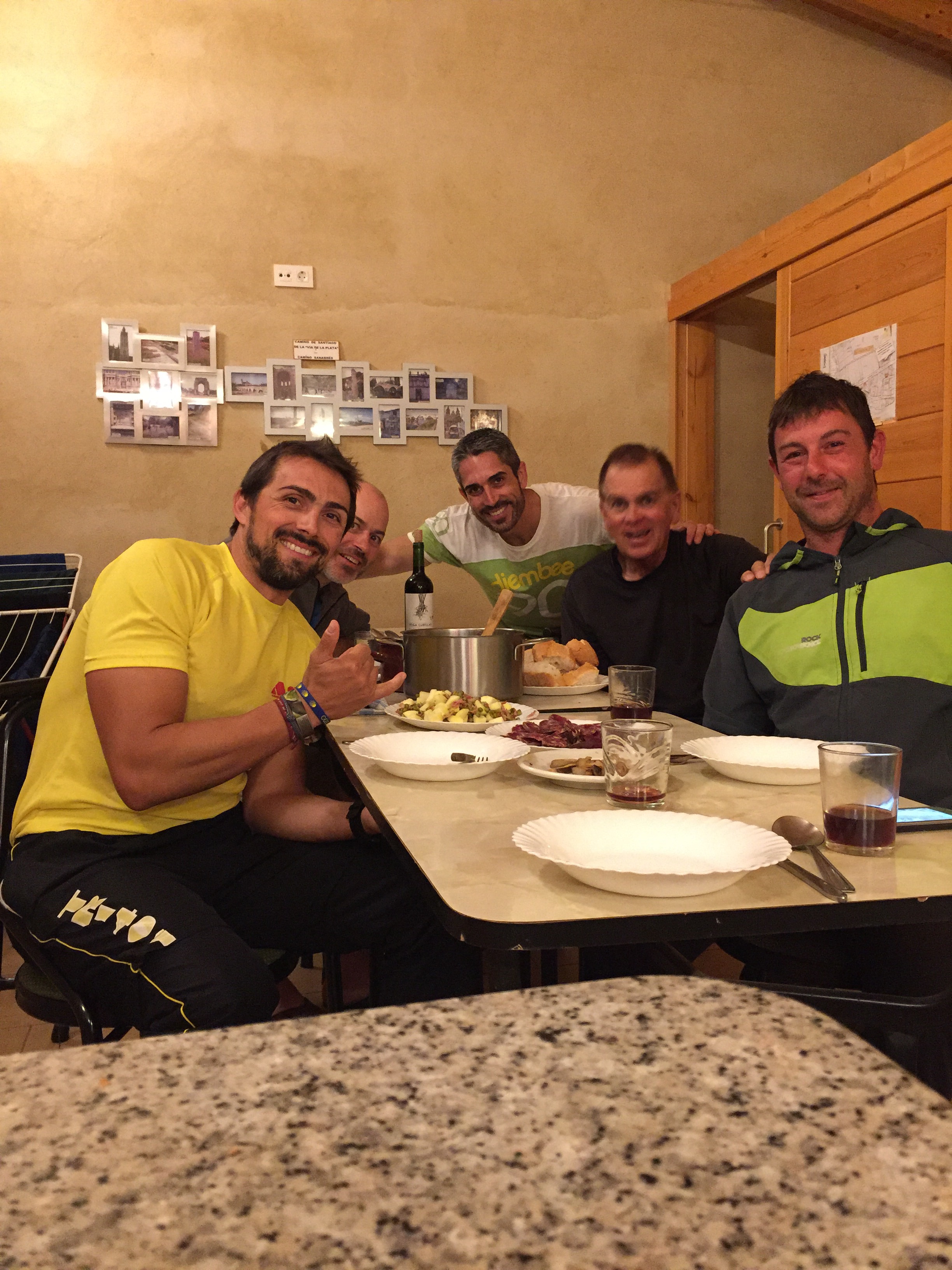 There were three other Spanish pilgrims at the alberque and two joined us for diner. Ashen cook and absolutely wonderful dine. Chicken and rice dish, fresh salad, peas with apples, fresh picked mushrooms (from the Camino) cooked in butter and garlic, and a few other cut up items from the store. The two Spaniards supplied the wine and I brought drinks and water. And I did the dishes too!