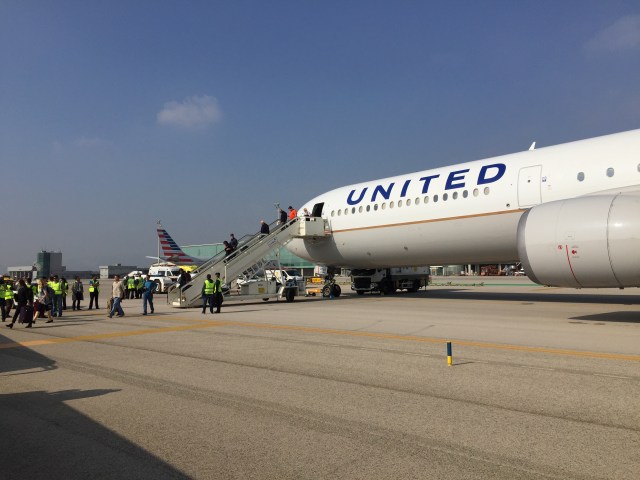 Getting off the plane after we were towed to near the terminal