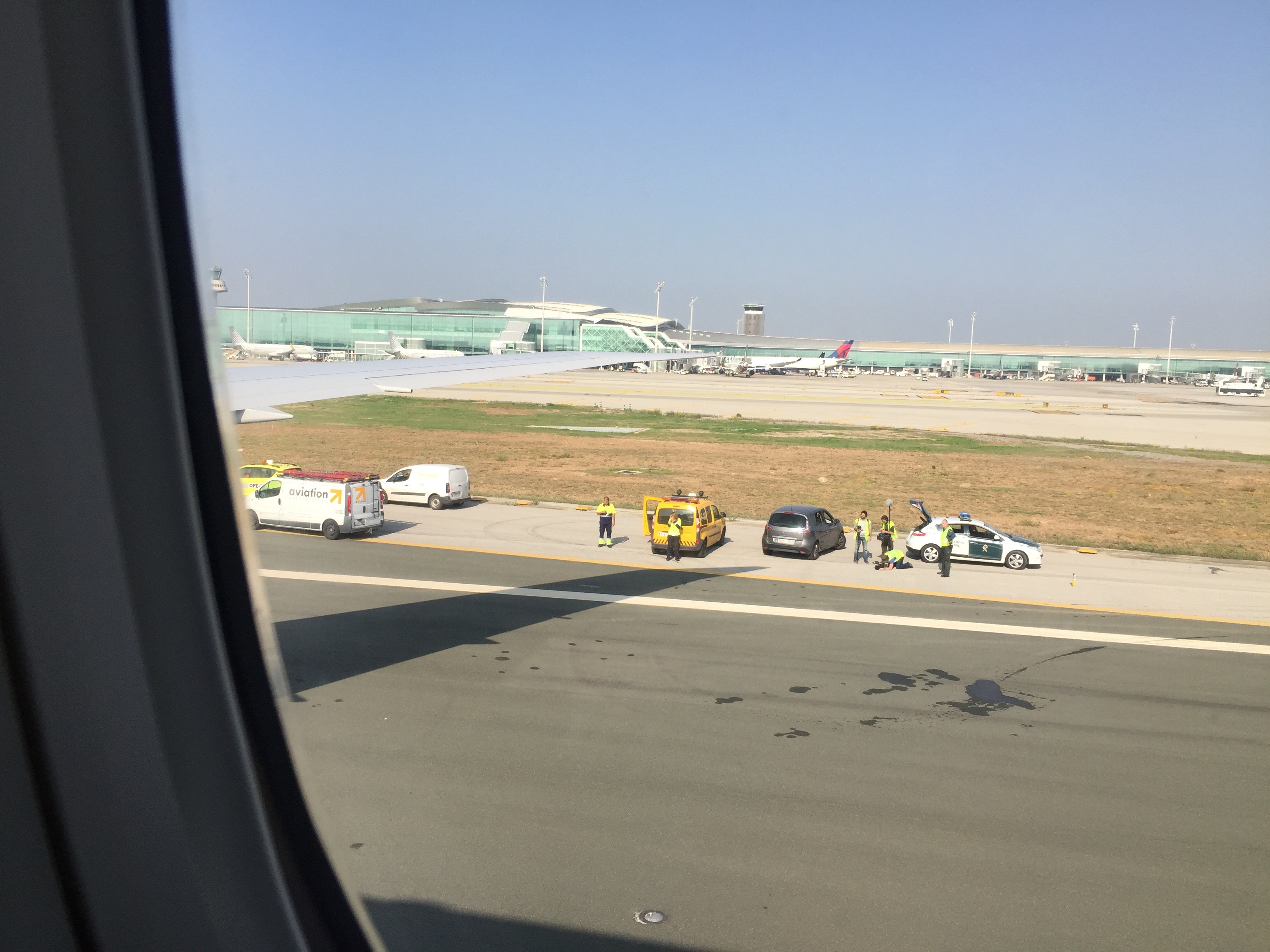 Getting off the plane after we were towed to near the terminal