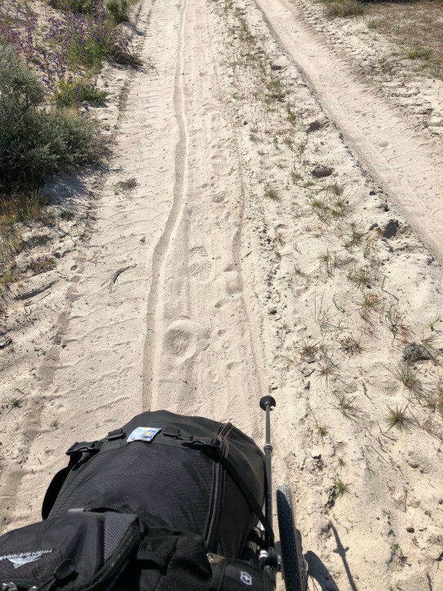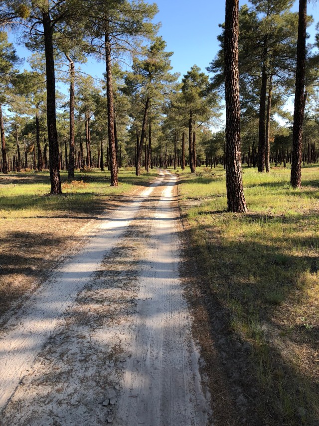 Walking through the pine forest with the sandy soil that makes it difficult to pull the Wheelie.