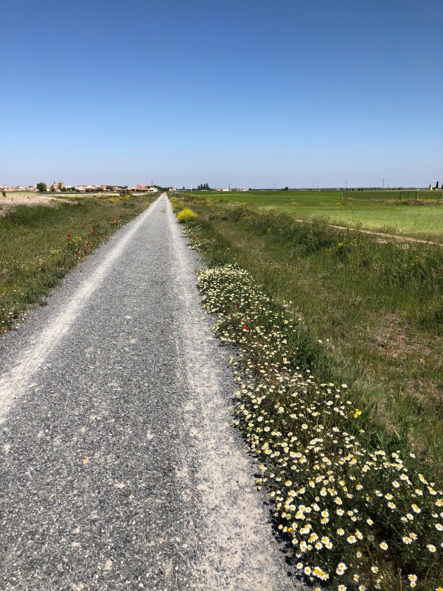 I pulled through about three miles and wondered if I could even do another seven miles? I was in an area where there was a 5-6’ berm to the right of the Camino when I saw the head of a bicycle rider pass at a fast speed! I had no idea where he came from and what he was riding on. I walked over the berm and saw what turned out to be another abandon railroad track that had been turned into a bike path with a solid hard-packed surface. Looking at my map it look like it had been running parallel to the Camino for at least two miles, and another two or three miles more. Why did they not run the Camino on that trail?