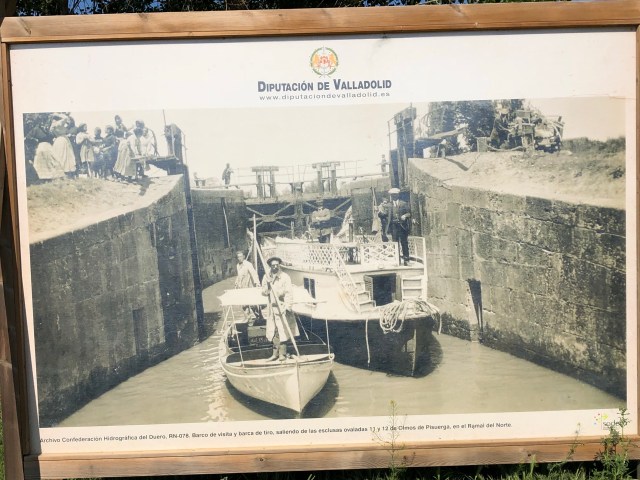 I loaded up my fifty pounds of groceries into my overload Wheelie and started out around eight. The Camino was only two blocks away and at that point started at the end of the Dársena del Canal de Castilla en Medina de Rioseco. This is an old canal that was built in the early 1900 connecting some of the small cities and has now become a draw for recreation because there is a bike/walking path running along it. The Camino runs on this path for about five miles. It is probably one of my favorite sections of any Camino I have walked. It’s shaded by trees and it’s flat and well maintained. At the end of the five miles, at the remains of an old mill, I was a little disappointed that the Camino moved onto a narrow asphalt farm road.