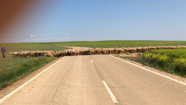 About a mile outside of town I saw a man leading a few hundred sheep towards the road where we would probably meet at the same time. It was funny because he didn’t have any dogs and the sheep were following him by what looked like his commands. as though he was talking to a dog. I had to stop because I think they have the right away out here, and I couldn’t help but laugh at this man talking and walking his sheep like was walking his dogs. Now, how can this be unpleasant and boring.