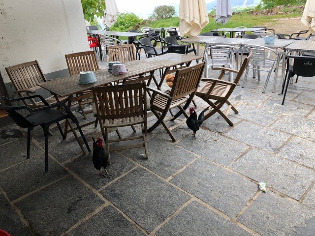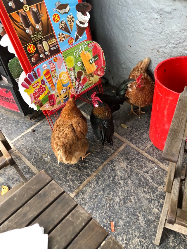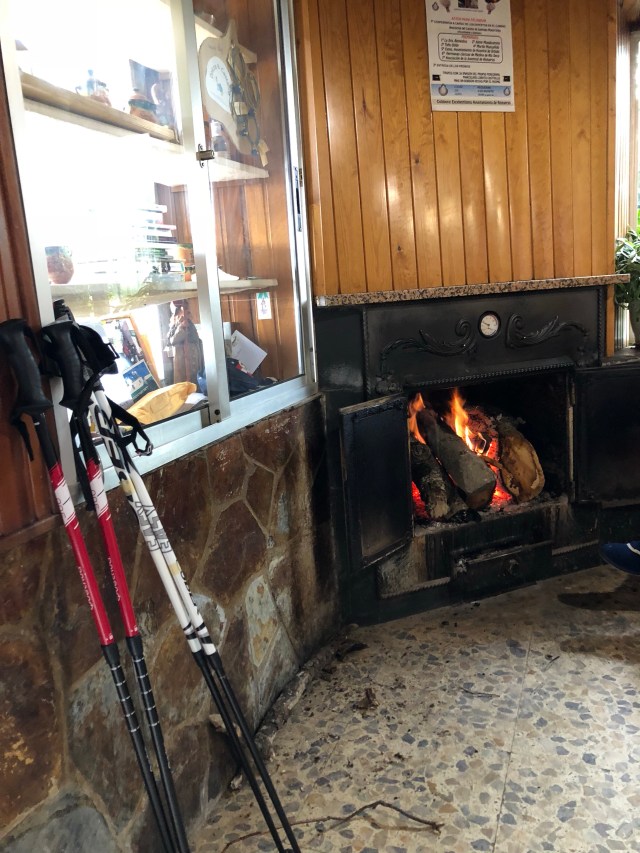 After a very long steep climb on the dirt and rocky Camino, it suddenly popped out at a bar at Alto do Pollo. I was tired and cold and I remember this bar from the last time I was here because they have a rotating fireplace blazing away. It was a welcome comfort on both my visits here. Funny that it’s called Alto do Pollo but I see why, because there are chickens running around everywhere in and outside the bar.