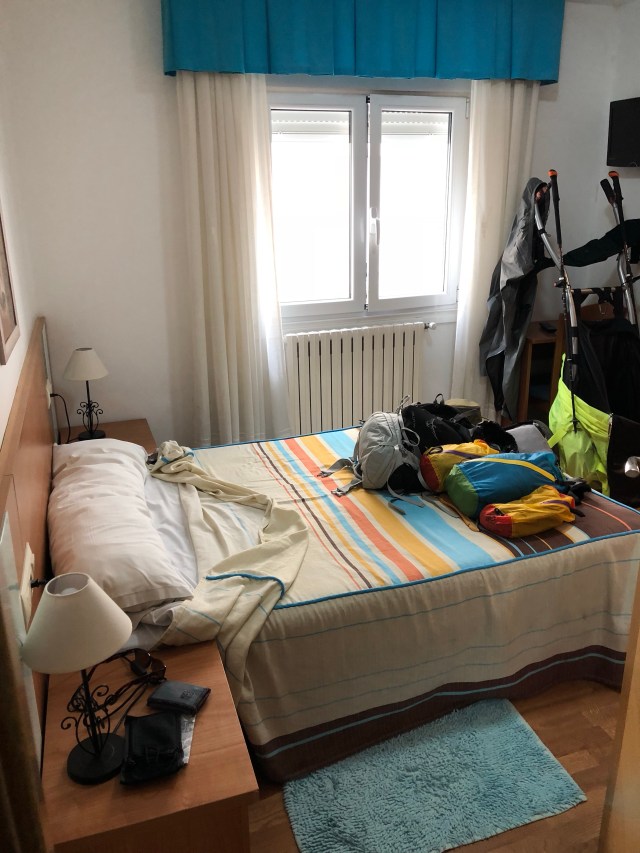 I got a reference to a pension from one of the hotels and fortunately they had a room available. I got here by noon and will rest the remainder of the day. The room and pension isn’t the nicest I have stayed at, but I am thankful because I would not want to be in a crowded alberque feeling like this when I just need to rest. I am only a half block from several bars, restaurants, and a store.