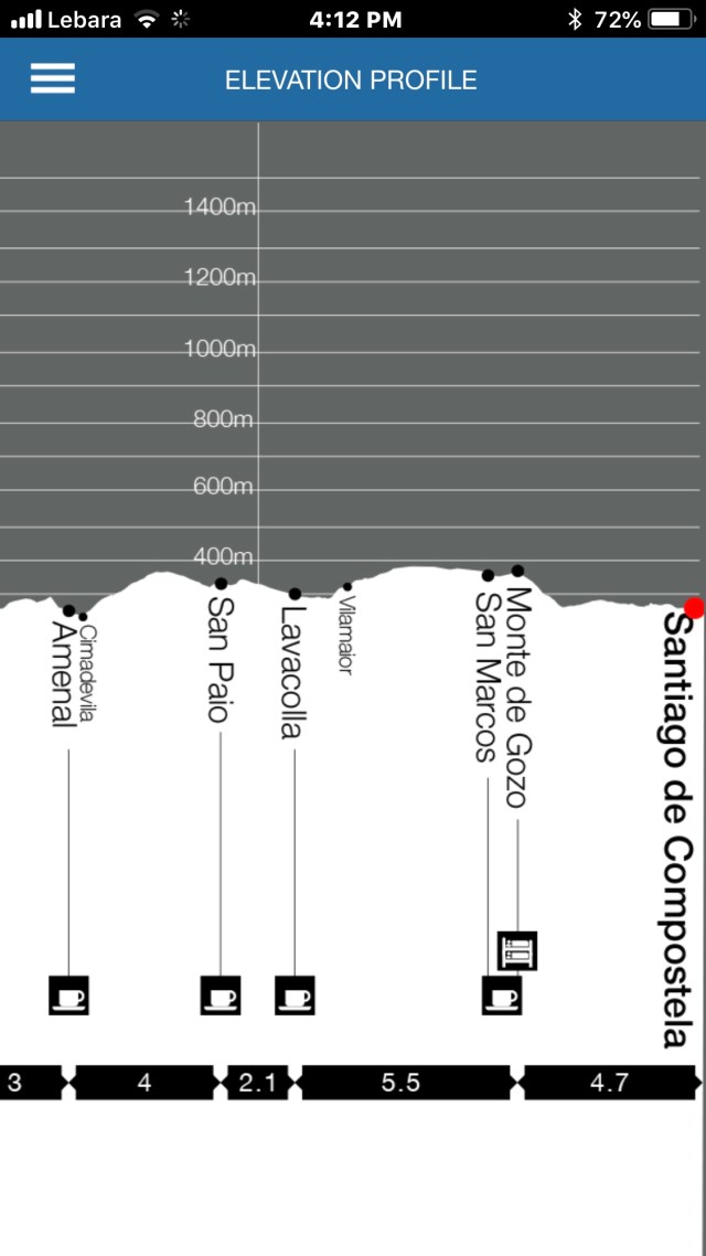 When I got to that last big hill and I could clearly see Santiago in the distance and that old stable horse in me picked up the pace even though I was almost out of gas. It was obvious that my being sick had been affecting my energy level because I have not had my rhythm since before getting sick.