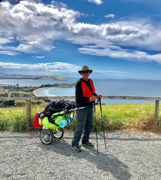 The view coming down to Karitane is beautiful. You can see the peninsula and the long sanding beach along the bay. The road going down is very steep and it was definitely time to use both the trekking poles to slow down.