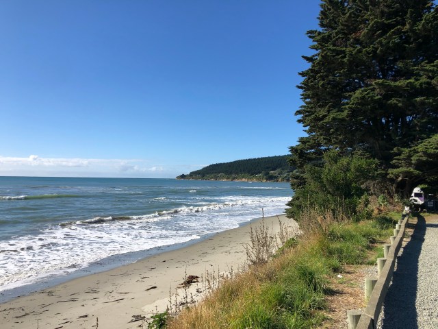 I stopped at a rest stop on a small bluff overlooking the beach and wanted to camp there. I saw plenty of places tucked away behind trees with ocean views where I could have camp but I wanted to check out the motorcamp in Moeraki.