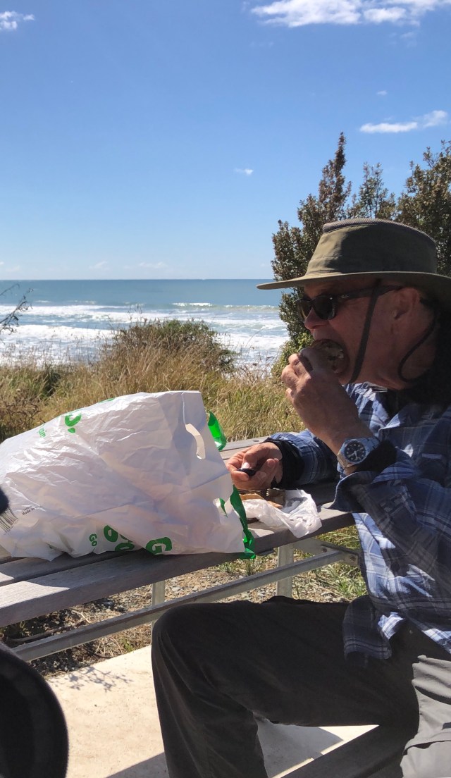 I was in that trekking rhythm all day long and I made Moeraki by 3:00. I would have been there much sooner but I took that long lunch on the bluff, and then ten minutes later a nice German couple stopped to talk with me. That lasted a half hour or so. No sooner did I start again when I ran into a nice couple from Australia bicycling. They were both 67 and had started in Christchurch and were touring the South Island in a similar way as me, with a tent, at motorcamps, etc. I love seeing older people, like me, going after their adventures.