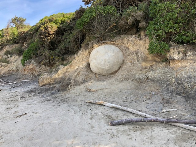 The stones are boulders that were embedded in the mudstone cliffs and were washed out by the wave’s erosion on the cliffs. There are different stones called Katiki Boulders at Shag Point, which are of a different makeup and contain dinosaur bones and fossils. A bit of trivia.