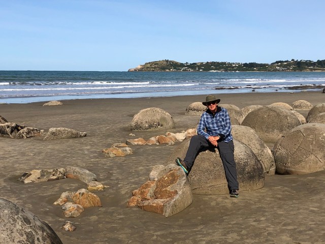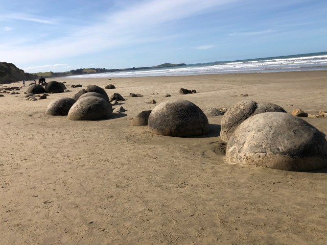 One thing that did trouble me was that this place is called Moeraki “Boulders” Kiwi Holiday Park, and it was right on Moeraki Boulders Beach, so shouldn’t those famous boulders be right at my front door! No, back down the beach where I came from, and 3.5 miles (5.63 kms) round trip! So the gluten for punishment that I am, I put everything away and off I went back south.