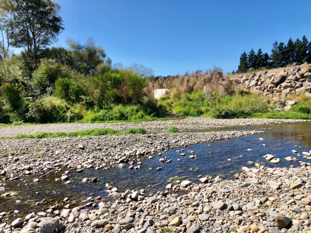 I had just crossed a fairly long bridge over the Otaio River and stopped on the other side to take a break. I was sitting on the guard rail and noticed a gravel road behind me that appeared to go down to the river. Wow, that looks interesting, I’ll go down and see the river as I was too busy hustling across the bridge to really look at it.