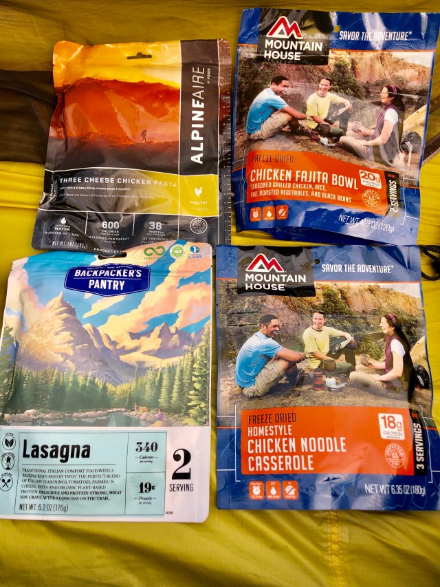 Tonight I had my choice of gourmet freeze dried meals. I just grabbed one and it wasn’t bad, but I think the atmosphere of being here and listening to the sound of running water made it taste even better.