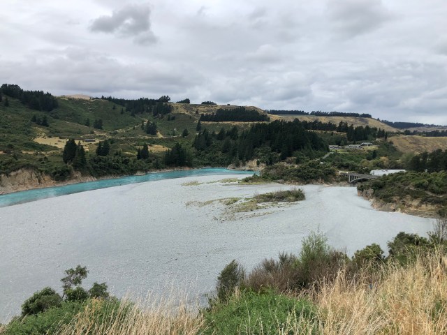 The last few miles before the decent into the Rakaia Gorge there was a long steady uphill climb of about two miles. Once at the top it drops down at a steep 8 degree grads. The view from the top is spectacular as you can see miles up into the mountain range from where the river is flowing. The color of the river water is so blue that it almost looks artificial.