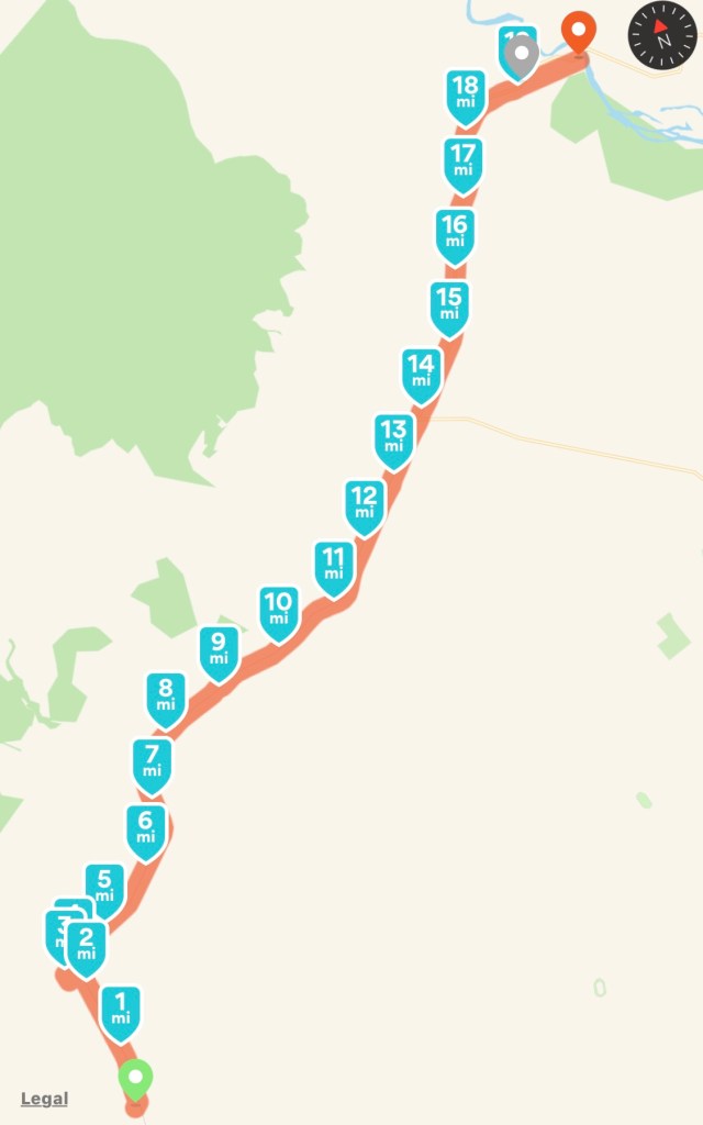 The road for the last four days has been a steady, but very slight incline. Not something you’d notice in a car but something I can feel pulling that 75-80 pound Wheelie. Today the incline was much more noticeable and had me working. Once I find my rhythm uphills usually don’t slow me down, even if they are long, so long as they are steady and not the constant ups and downs.