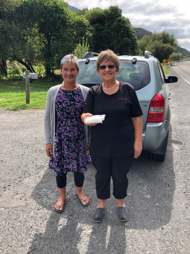 The road had two other steep climbs until I finally reached that last one after noon. I was fairly tired and wasn’t sure I’d have enough time or energy to get to Kaikoura. I was getting hungry and stopped and had my last two carrots and wished I could find a store. No more than ten minutes later a car stopped on the other side of the street and a woman named Jenny came over to me. First thing she said was, “my daughter and I saw you and thought you looked hungry, so we wanted to give you this, but it is all we’ve got.” Karma? She had some homemade bars/baked goods that were delicious!
