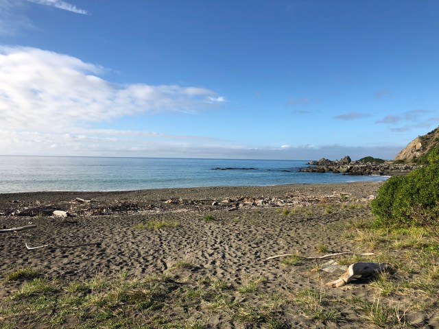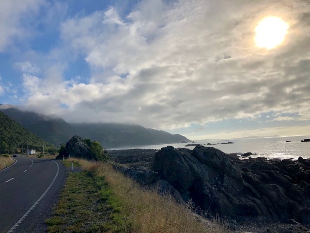 I wasn’t planning on going beyond Kaikoura today and it was only about 12 miles, so I didn’t hurry to get going. I woke at 6:30, later than normal, and packed up and headed out the door a little after 8:00. All I had left for breakfast was some peanut butter with chia seeds and some whole grain crackers. I figured I’d make Kaikoura by the time I was hungry.