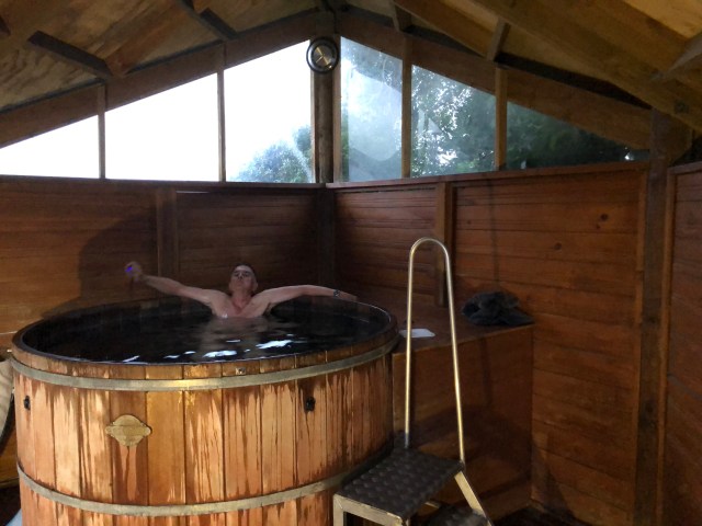 The tub is a traditional redwood one that is completely fenced and locked, for my use only. Glad for that because I didn’t bring swimming trucks! Wow, if I could end every trekking day with a shower, good meal, and then, a hot tub, wow!