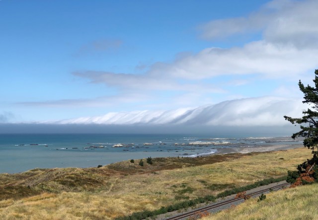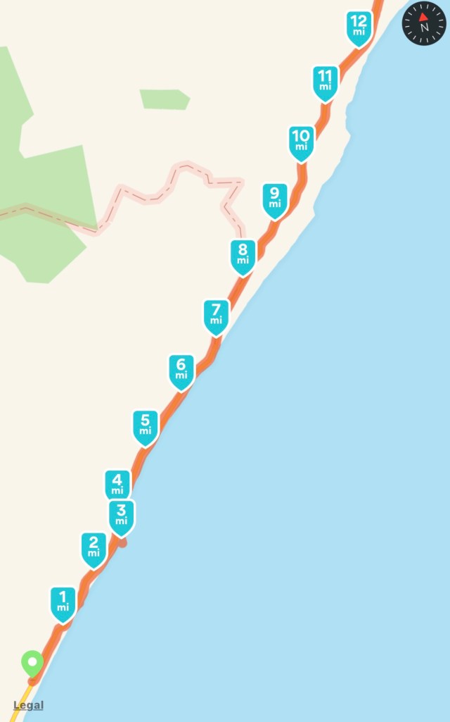 For the rest of the day, until about noon, the road was flat or slightly rolling and it ran parallel to the coast line. It turned inland once and started a steep uphill, and then dropped back down to the ocean.