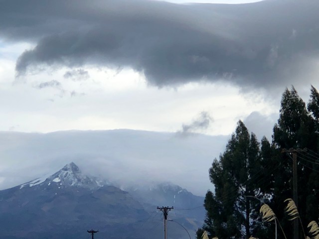 I packed up and was heading out of the door at 8:00 and walked right into a cold strong wind, and sky looked ominous with black clouds rolling in. In the distance I could see the mountains were shrouded in clouds and the tops were covered in snow.