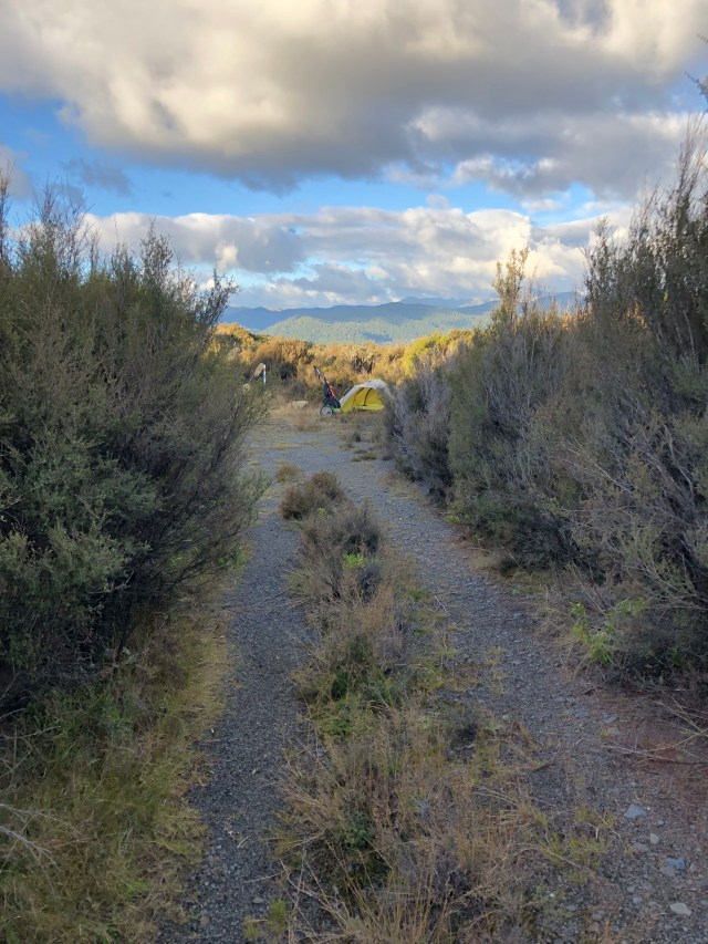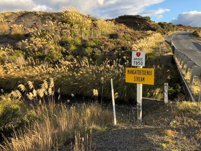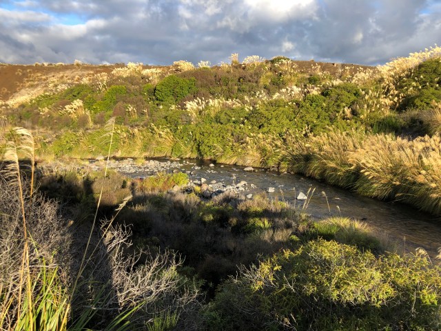 I had not really looked at my watch most of the day because I was so bundled up, but around 4:00 I decided to look for a place to camp. There are no trees and everything looks brown, but for once there were many places to camp but I wanted someplace with a wind break. I saw a dirt road next to the Mangatoetoenua Stream and followed it down. It wasn’t very long and ended at a stacks of old wood beehives. I found a nice level spot that is protected by tall bushes, and it is right next to the stream and I can hear it.