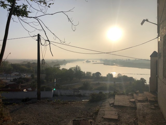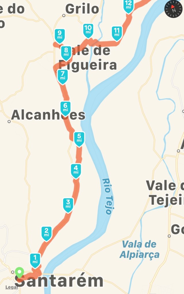I left the hostel about 7:30 to a nice cool morning and literally no one on the streets. I walked through the beautiful old part of Santarém that is built to the edge of the hilltop, where the Camino starts its descent. The view going down was very beautiful as you could see the river in the distance as the sun was coming up. At first it started out as a nice cobble pathway and within a few hundred feet it turns into a rough and very steep rock and dirt path. I was surprised how steep it was and found myself using both trekking poles to keep from slipping, and having the Wheelie made it much harder.