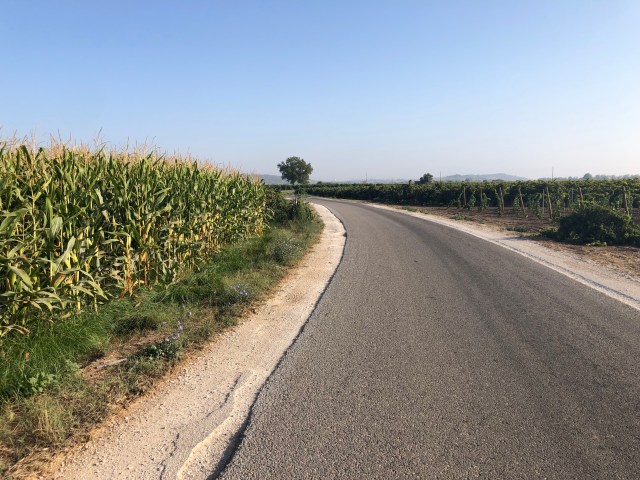 The Camino on the farm road through the grape and corn fields
