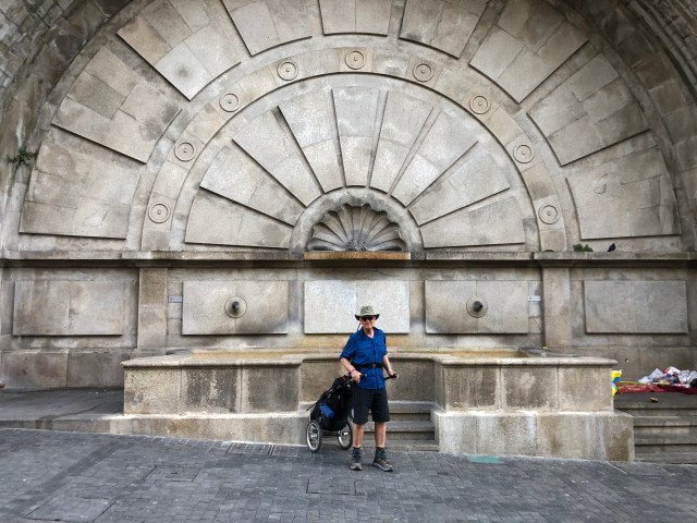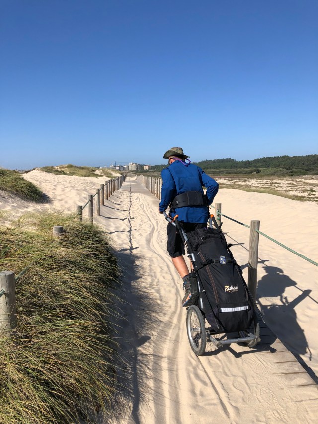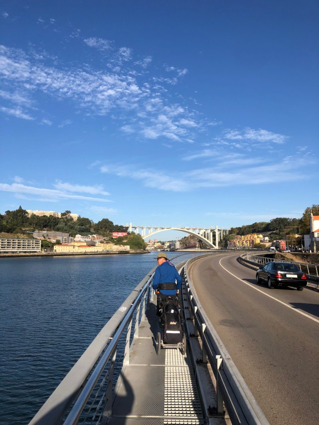 Being some distance from the start of the coastal route, we walked to the metro station and then took a subway back to the Porto Cathedral where we had taken the Uber yesterday. Walking through cities, especially the big ones, is always a little challenging with the Wheelie. It was three stories down to our subway platform, and because the elevator was not working, I had to use the escalator, which is a bit tricky with the Wheelie. Once down on the train platform we realized we were on the wrong side, so back up the escalators and then back down on the other side. Then of course it’s standing in the subway car trying to negotiate the Wheelie between the morning commuters and staying out of the way of everyone standing and going in and out on stops. We got to the cathedral fairly quick and got off at the exact place we got picked up yesterday, so I felt I didn’t miss any of the Camino.