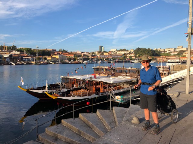 We walked down a steep street to the Douro River where the Coastal Camino starts. It is also the place where the many tourist boats dock, and that time of morning the docks were already starting to get crowded with tourists. Having the Wheelie always draws attention, and one of the first persons to approach me was a tourist from Wisconsin wearing a Green Bay Packers shirt, my favorite football team. Actually, the best team!
