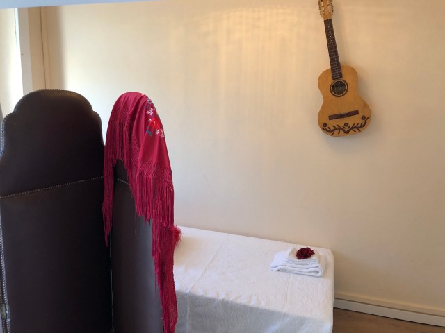 The room was decorated in a Portuguese music theme that is popular here. The shawl represents something in that theme